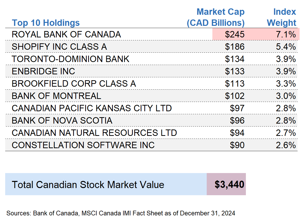 Vanguard follows a traditional market capitalization-weighted indexing approach. In this strategy, each company’s weight in the index is proportional to its market value. For example, if RBC’s market cap is approximately $245 billion and the total Canadian stock market’s value is $3.44 trillion, RBC would represent roughly 7.1% of the index.