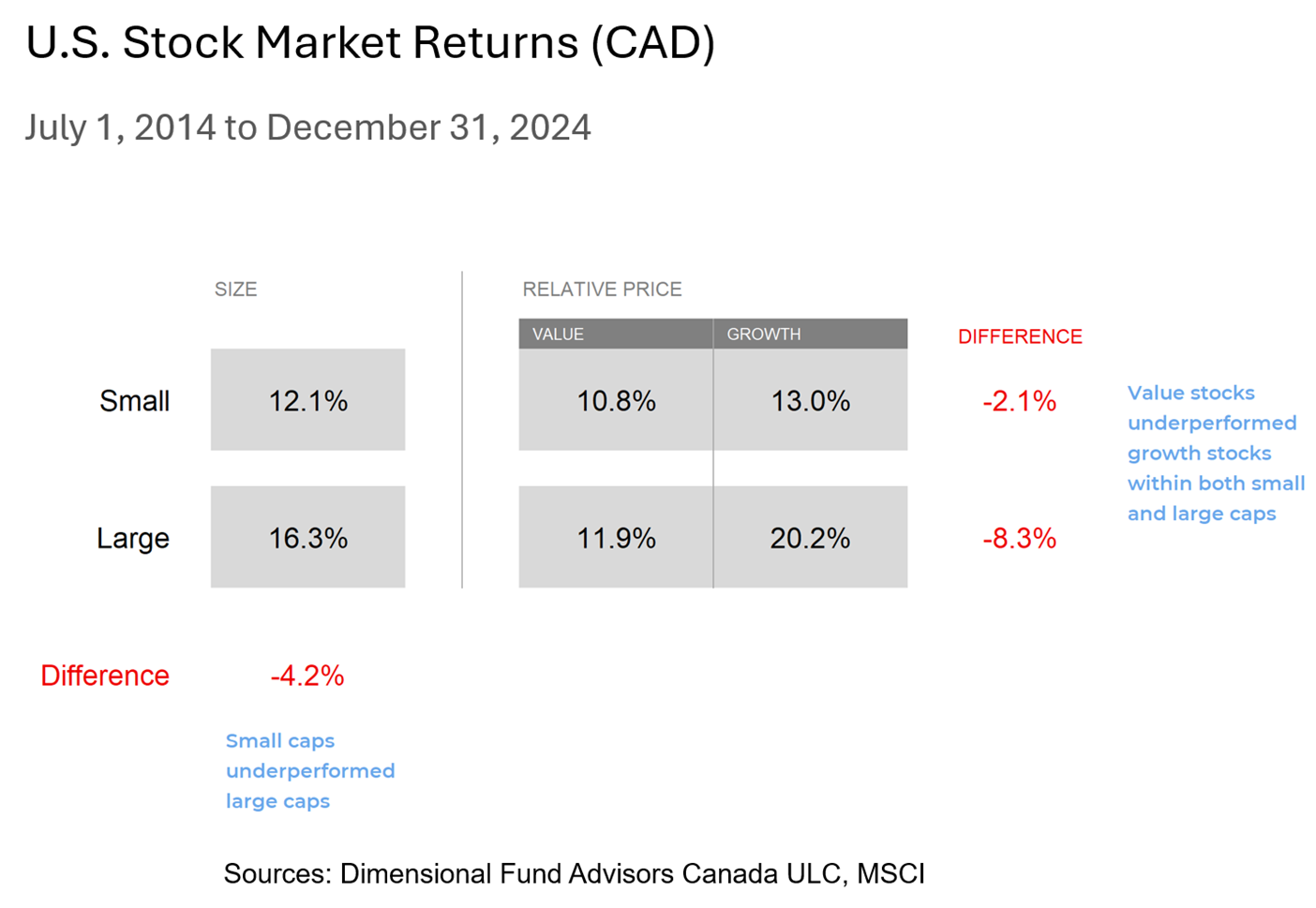 Much of the performance gap can be attributed to the negative small-cap and value premiums in the U.S. over this period, where: