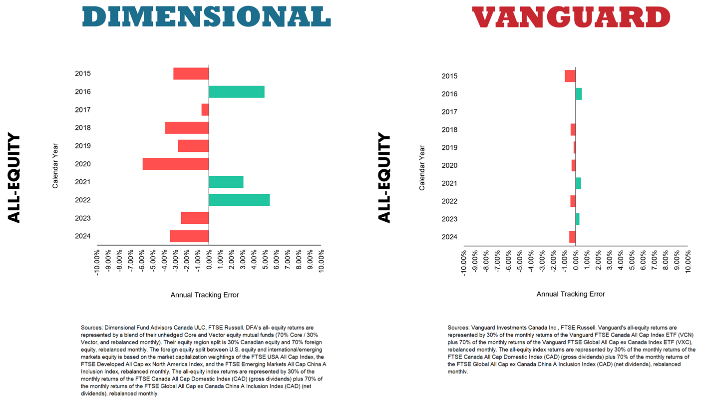 We’ve seen this in practice. Our custom Vanguard All-Equity Portfolio has shown minimal tracking error year after year. In contrast, our custom DFA All-Equity Portfolio has experienced wider return swings—both above and below market performance.