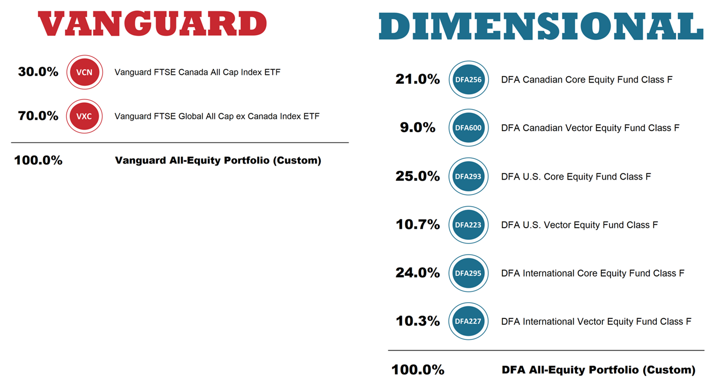 When it comes to leading passive investment products in Canada, two names quickly come to mind: Dimensional Fund Advisors (DFA) and Vanguard. Over the past couple of decades, I’ve had the opportunity to build portfolios using funds from both providers, gaining firsthand experience with their unique approaches. After spending countless hours analyzing their strategies, performance, and structures, one thing is clear: there’s no one-size-fits-all solution.
