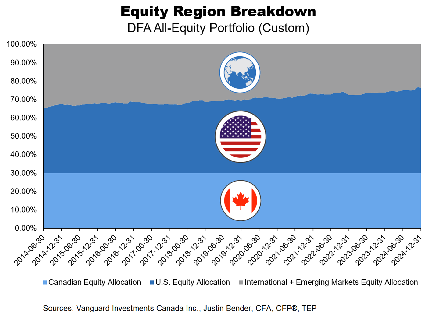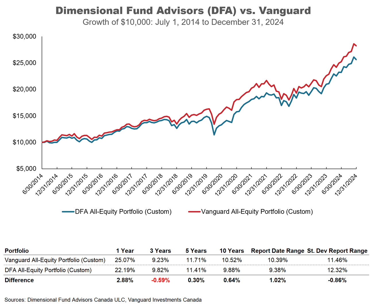 DFA, while traditionally more expensive, has significantly lowered its fees over time. At the start of our review period, DFA’s average MER was over 0.48%. Today, that’s down to 0.28%. While still higher than Vanguard’s 0.17% weighted average MER for a VCN/VXC mix, it’s in line with VEQT’s 0.24% MER.