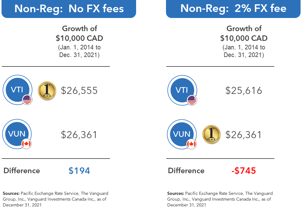 In a perfect world with no currency conversion fees, the lower product costs of VTI vs. VUN would have resulted in slightly more growth for VTI over our measurement period. However, if we assume a 2% currency conversion fee on the front-end purchase and back-end sale of VTI, we find VUN to be a much better option for these account types.